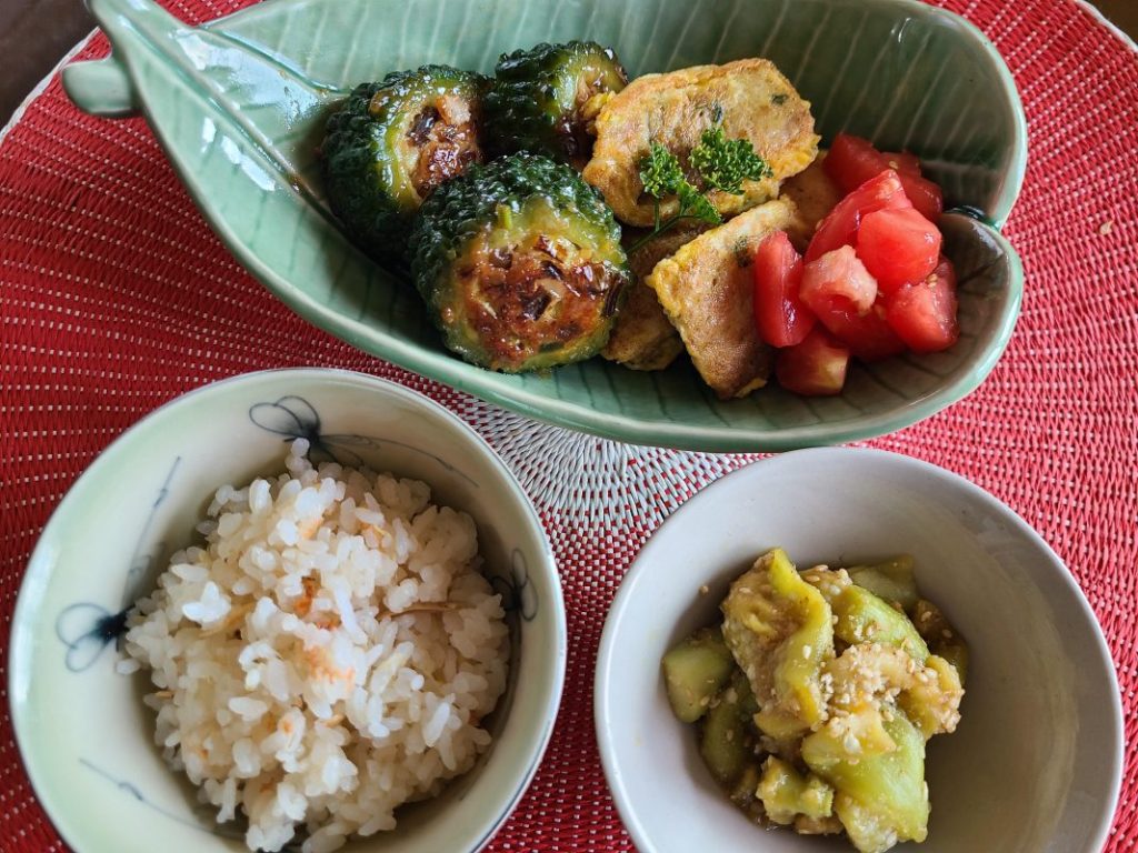 9月のメニューは、桜えびと生姜の炊き込みご飯、白身魚のカレーピカタ、ゴーヤの肉詰め、茄子の胡麻酢和えです。Eフィットウィルのオンライン料理教室では、野菜がたっぷりとれる、時短調理の裏技が役立つ、レシピのレパートリーが増えた、教室で作ったお料理を家族みんなが楽しみにしている、など好評をいただいています。